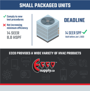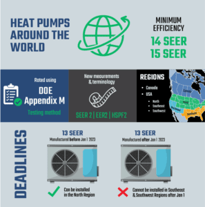 The minimum efficiency for heat pumps in Canada will rise from 14.0 to 15.0 SEER.