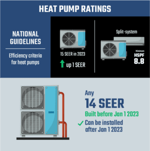 National guidelines govern the minimum efficiency criteria for heat pumps. The revised minimum efficiency requirements for heat pumps will rise to 15.0 SEER in 2023, an increase of 1.0 SEER. Additionally, split-system heat pumps must have a minimum HSPF of 8.8.