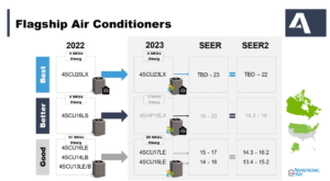 All items must be rated beginning in 2023 using the DOE appendix M1 testing method, indicated by the letters SEER2, EER2, and HSPF2. The external static pressure test is being increased from 0.3 to 0.5 ESP.