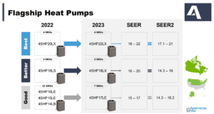All residential products 5 tons and under are affected by this regulatory change. New measurements and terminology, SEER2, EER2, and HSPF2, will be introduced in 2023. The new SEER2 ratings will be lower to accommodate the more challenging testing, and the minimum efficiencies will change and appear lower because of the new testing standards. The airflow set point for indoor blowers will change due to the revised test technique for fan coils and furnaces.